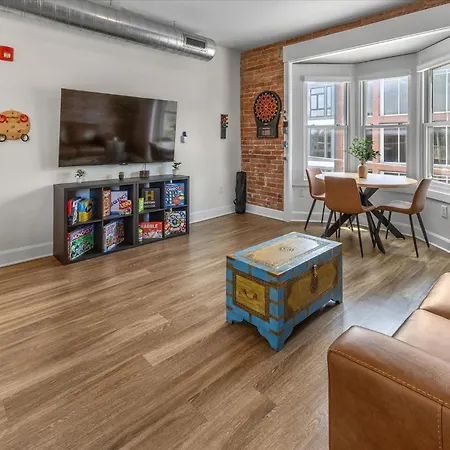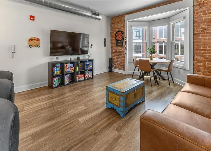 Com comodidades de spa, como solário, jacuzzi e sauna, o Downtown Indy - Famous Mass Ave With Balcony Apartamento Indianápolis de 93 m² está situado a 25 minutos a pé de Museu do Estado de Indiana. Além disso, este apartamento de 2 quartos garante a segurança dos hóspedes através de cofre e segurança 24 horas, oferecendo também vistas para a cidade.